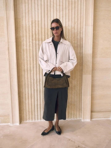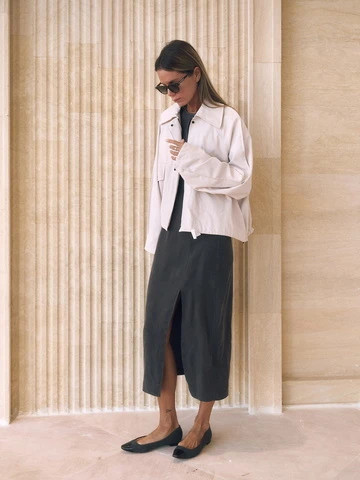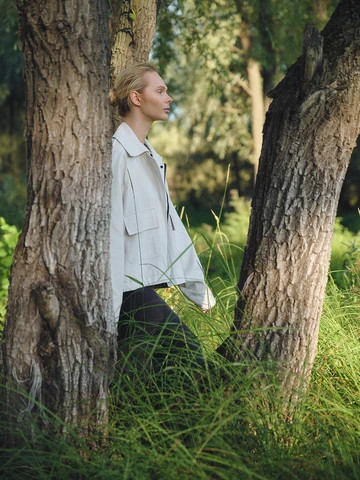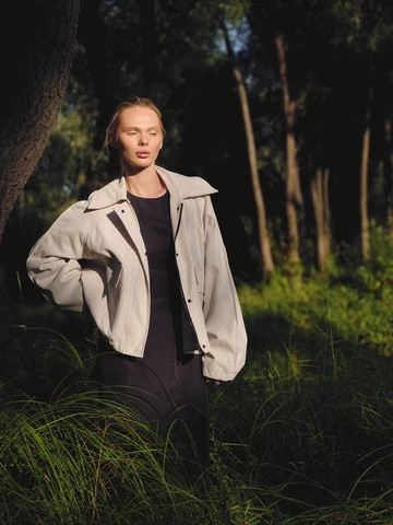 Укороченная куртка свободного кроя с подкладкой из поливискозы. Выполнена из матовой ткани с бархатистым эффектом, обладающая легким водоотталкивающим покрытием. Рукав реглан, планка на скрытых кнопках, карманы-клапаны и длина до середины бедра. Фиксаторы на рукавах и по низу позволяют регулировать посадку и объем куртки.