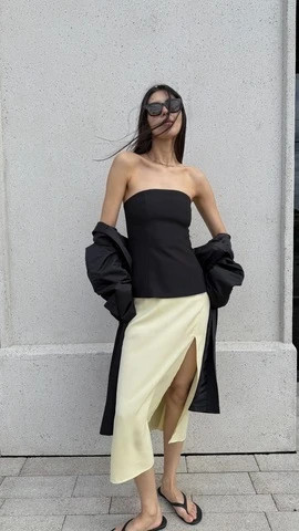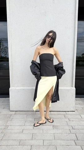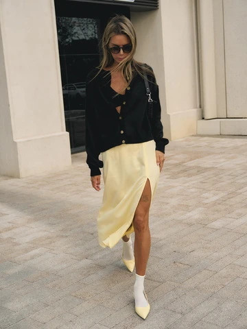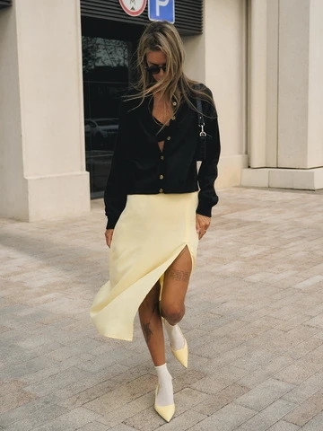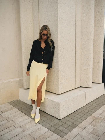 Юбка длины миди с разрезом спереди. Выполнена из бархатистого 100% тенсела. Свободный силуэт, высокий разрез ,пояс с эластичными вставками по бокам и застежка на скрытую молнию сзади. Универсальная модель, которая будет отлично сочетаться как с туфлями, так и с кедами.